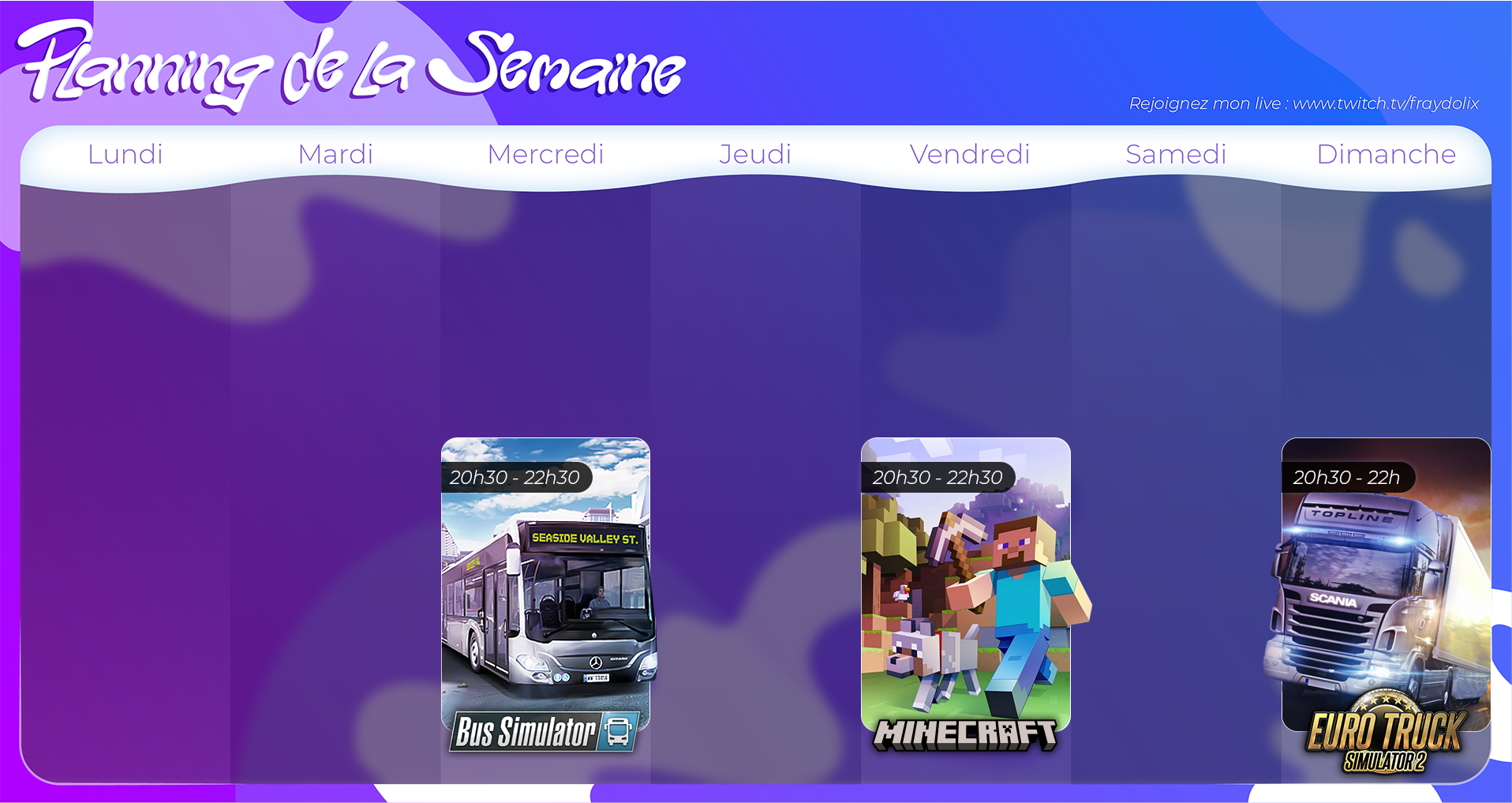 Fraydolix m'a contacté afin de mettre à jour la direction artistique de sa chaîne, tout a été refait, du logo à la bannière, incluant aussi la scène d’intro et de fin, le planning, les alertes ainsi que les transitions.